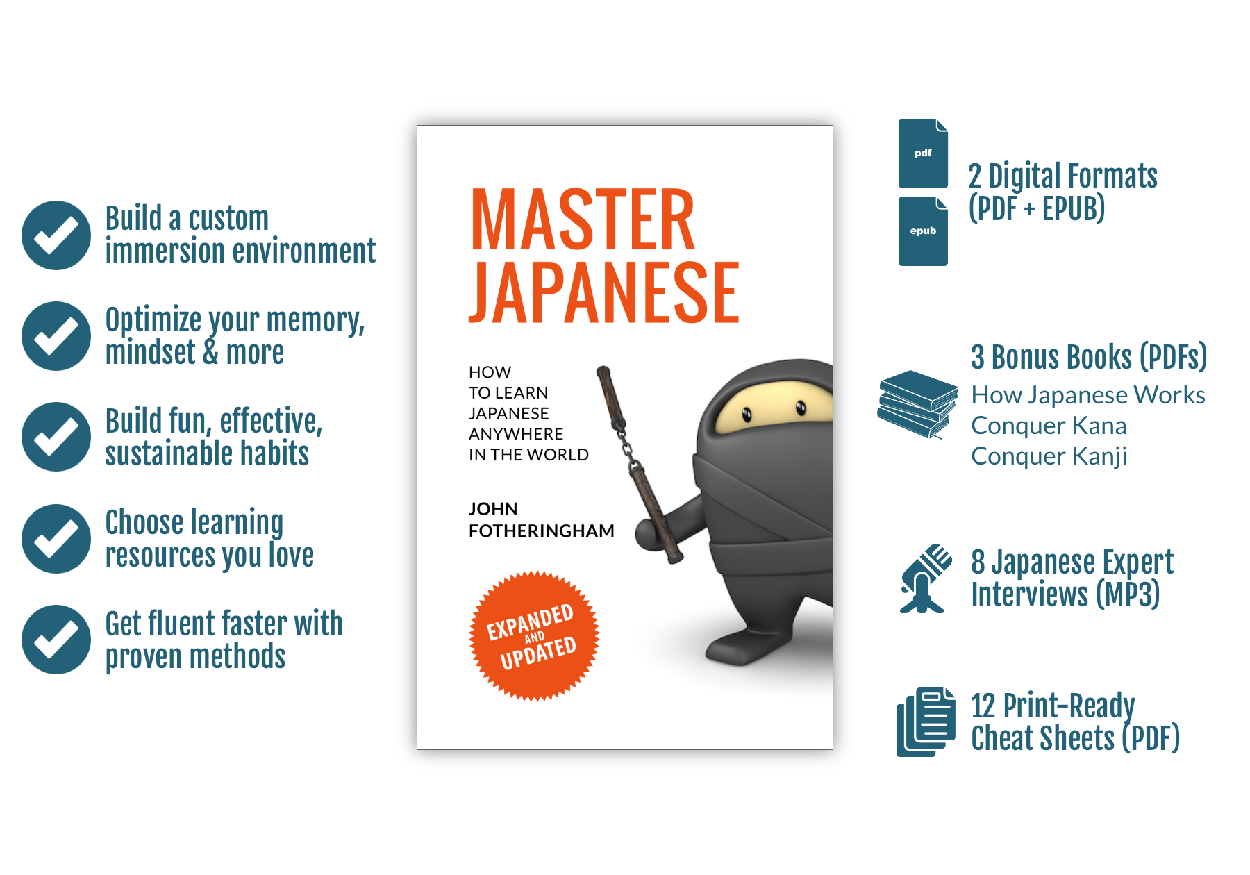 You don’t need a plane ticket, new zip code, or classroom to immerse yourself in Japanese. With the right methods, materials, and attitude, you can reach a high level of fluency right at home. Master Japanese shows you how to create an immersion environment almost as good as being in Tokyo, even if you’re in Tacoma or Topeka.